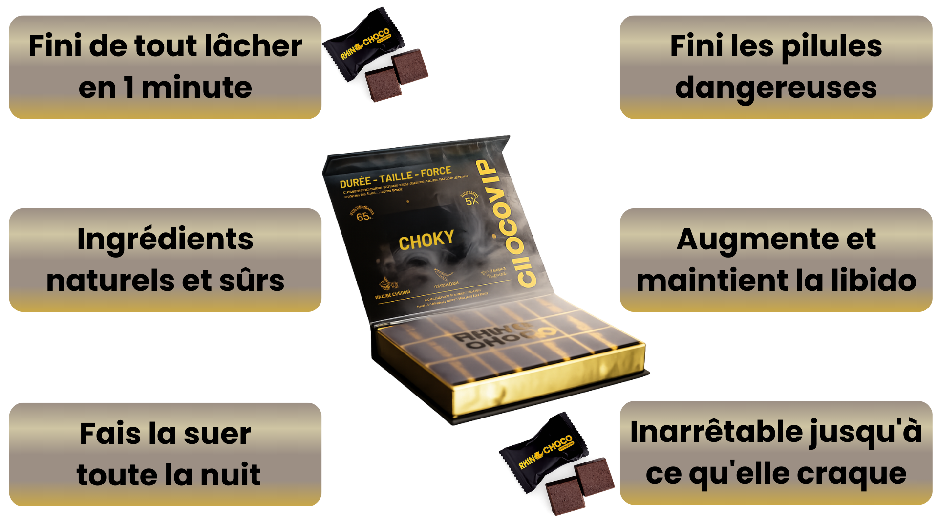 RhinoChoco contient des ingrédients naturels aphrodisiaques reconnus : Maca péruvienne (stimule la libido), Ginseng (améliore l'endurance), Tongkat Ali (booste la testostérone naturellement), et L-Arginine (favorise la circulation sanguine vers les zones intimes). Le cacao 65% amplifie ces effets grâce aux flavonoïdes qui dilatent les vaisseaux sanguins.